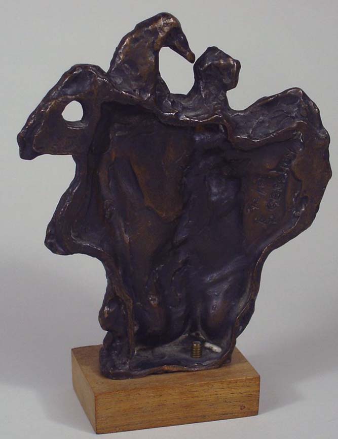 The following is submitted by Cornelia Seckel, publisher Art Times Profile: Eugenie Gershoy By RAYMOND J. STEINER Art Times November 1984 EUGENIE GERSHOY: an emigre from a pogrom-threatening Russia, a member of a distinguished family of the intelligentsia, a life-long artist whose career began before the age of four, a woman of eclectic tastes and cultured learning seasoned with a loving and satirical eyehow and where does one begin to capture her in all her facets? Largely a natural talent with a smattering of formal training, it has been through sheer force of her irrepressible creativity that she has attained a stature and versatility in the world of art that few can match. Represented in almost every major collection (the Whitney Museum of American Art, the Metropolitan Museum of Art, the National Museum of American Art, the Syracuse Museum of American Art, the Delgado Museum of Art, Skidmore College of Fine Art, to name a few), she has exhibited her work in numerous shows from New York and west to San Francisco and south to New Orleans, culminating in her most recent, a special show of her sculptures entitled "Fantasy and Imagination in Sculpture" at the Smithsonian Institute in Washington, D.C. which will continue until January 20,1985. Honors and awards began as early as 1914 when she received the St. Gaudens medal for fine draftsmanship and have continued throughout her career of creating, of teaching and active membership in over twenty gallery and art associations. A recent article in the Smithsonian was the last of almost fifty such pieces on either herself or on her art in various publications from across the country and from as early as the'30's. The astonishing diversity of her life's work is scarcely hinted at in the accompanying photographs. To select any one aspect of Ms. Gershoy's life or work would, of course, lead to distortion and an incomplete picture of her contribution. Fortunately, in addition to being a fine artist, she is highly literate and capable of verbalizing her own growth and artistic concepts, sharing copious notes that she has saved over the years. (An example of her writing and expressions on art can be found in the "SPEAK OUT" section of this issue of ART TIMES.) A chronological highlighting of her career, therefore, seems the only way to do her justice. Exposed to the "masters" in a collection of art books owned by her parents, Ms. Gershoy "drew assiduously from the age of three on" At five, she was copying Michelangelo, Rafael, and daVinci never suspecting that these were, in fact, reproductions of sculpture in three dimensions. Eventually, she drew from life, adding a lively sense of color as she experimented with crayons, colored inks, watercolors, and oils. At thirteen, she set about illustrating "Little Women." Resolving to become a painter and illustrator, she took advantage of a scholarship and entered the Art Students League of New York. Disappointed that the painting class was full, she turned to leave only to be stopped by a young woman who suggested she take a modeling course instead. "What is modeling?" was her immediate response, not having any knowledge of sculpture up until that point. The young woman was Hannah Small Ludins (a sculptor featured in the September issue of ART TIMES) and through their association in the modeling class of A. Stirling Calder, became life-long friends. A second year's scholarship, however, could not keep her within the confines of a classroom, and she left shortly after for Woodstock, NY where, under the auspices of Hervey White and the arts colony, she came under the influence of sculptor John Flannagan. Inspired by him and responding to her own sense of freedom and a need for direct interaction with materials, she carved in the profusion of materials which were indigenous to the Woodstock areafield stones, apple wood, chestnut wood, old mahogany and oak beams, even old gravestones. After some years, however, she found both the materials and the classical formulae with which she was working was too restricting to her growing interest in the dynamism of everyday life (the accompanying photograph of "Lilah" is a sample from this period.) A brief interlude in a lyrical, romantic style with 'terra cotta' figurines served as a transition to a new series of works which allowed her more freedom to capture form and movement. This was a series of characterizations of her fellow artists of which the photo "Arnold Blanch" is an example. One can see in these spontaneous impressions as exemplified in the Blanch sculpture an increasing awareness of humanity not found in the cold, classic lines of her "Lilah". A humanist above all, it is humanity in all its ebullient manifestations which captivates Eugénie Gershoy's eye, wit and creative genius. Often tongue-in-cheek, her satires show her unerring observations of man at his most human-ness. What might decline into mere caustic statements in a more bitter soul, however, is rendered more often into whimsy that reveals the artist to be hopelessly in love with her fellow man and irremediably committed to a faith in their essential goodness no matter what lengths they go to prove their ridiculousness. At bottom, her joy at capturing human comedy stems more from childlike delight than from malicious intent. Also during this time, Ms. Gershoy began her sculptures of animals, her "Camel" reproduced here an instant success. And, although we are here concentrating on her sculptures as representative of her evolution, she was as prolific in her output of paintings and drawings in watercolors and gouaches, drawings, pastels, etchings, lithographs, serigraphs, exhibiting them all and constantly seeking new mediums to express the creative urge coursing through her. The Woodstock experience inspired her to even experiment with wood-blocks and linoleum cuts and it was here that she enjoyed her first attempt with papier-mâché, creating a mammoth "Maloch" for Flaubert's 'Salammbo' in 