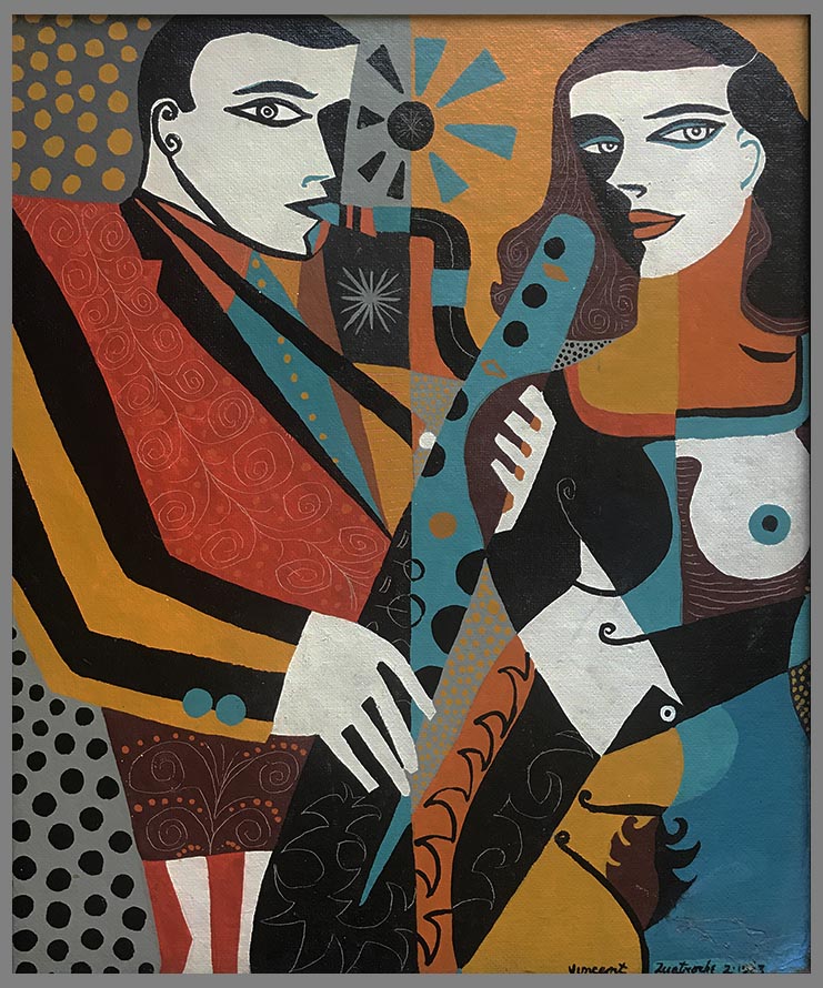 Quatroche had been an artist from a very young age. The painter was the son of a jazz drummer who died just after Christmas 1938 in a car accident with his band, The Suffolk Serenadors. Jazz is a theme that runs through both the painter’s work.